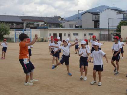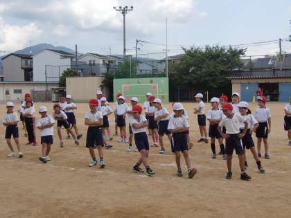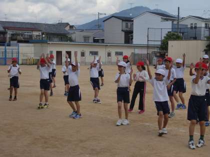 3年生が団体競技『バンブータイフーン』の練習の前に,全校ダンス『みんなの歌』を踊っています。