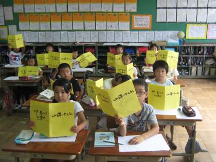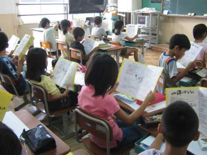 昨日,ご家庭にも届いたと思います,「かっこいいしきん」と「四錦のやくそく」。子どもたちもいつでも見返すことができるように,学校に置いています。二枚を表紙をつけて綴じました。