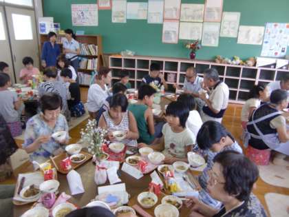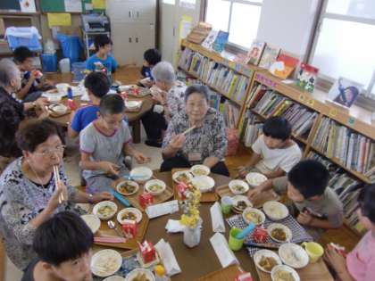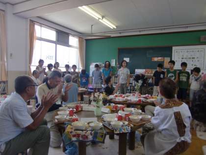 今日は『すこやか給食』の日です。5年2組の子どもたちが地域のご高齢の方々と給食を一緒に食べながら語らいます。