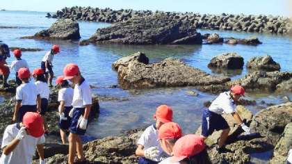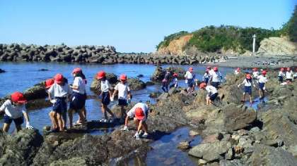 只今,宮崎浜で磯の生物探索中。台風一過,いつも以上に海辺の景色が鮮やかに見えます。