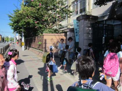 PTA本部役員の方々が、子どもの集団登校に付き添ったあと、校門前で子どもたちを出迎えてくださっています。集団登校の時間が違うので、だんだんメンバーが増えていかれます。