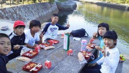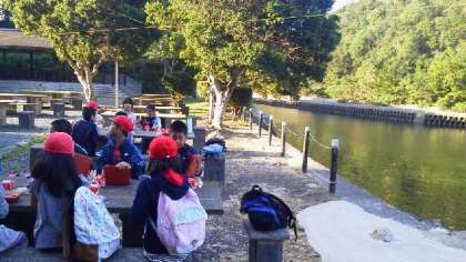 皆さん,おはようございます。3日めの朝,深谷水道を見ながら食事中です。