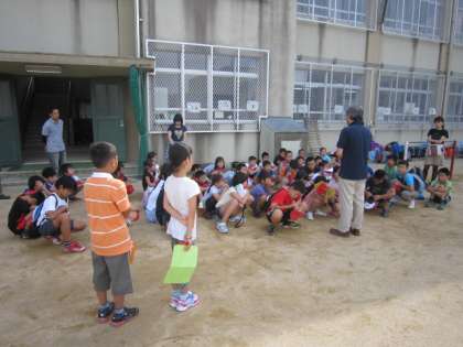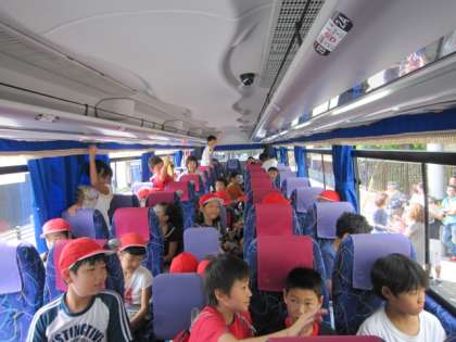 まず1日目。午後2時の出発。交通もまだ、混乱している中、出発式を終えて元気に学校を出ました。バスの運転手さんも、情報を集めながら、一番良いルートを探してくださるのですが、なかなか滋賀県から出られません。名探偵コナンのビデオが繰り返し流されましたが、子どもたちも我慢強く、バスに乗り続けました。