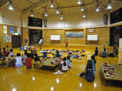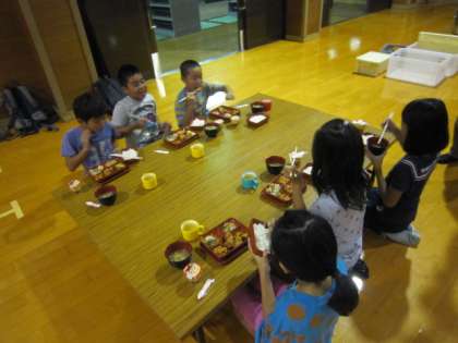バスがみさきの家に着いたのは、午後7時9分。その後プレーホールで、すぐに夕飯です。みさきでの食事のルールがここから始まりました。お腹を減らした子も多く、「おいしい」という声がたくさん聞かれました。