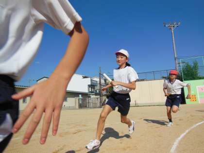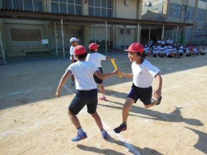 今日は、チームの仲間と初めての顔合わせをしました。走順を話し合って決め,バトン渡しの練習もしました。