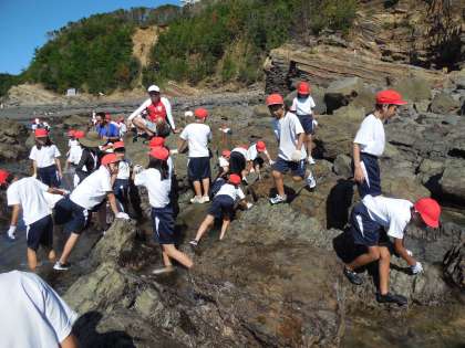 でこぼこ岩を乗り越え,生き物がいそうなところを探します。