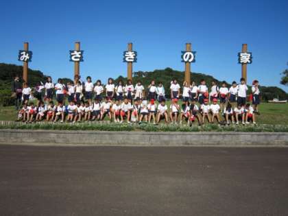 素晴らしいお天気のもと、緑の鮮やかな芝生グランドで記念撮影をしました。あまりにまぶしすぎて、レンズを見ることができない子どもたちもいました。吹く風が心地よく、すばらしい一日でした。