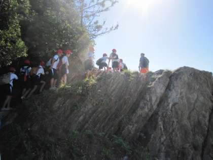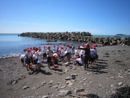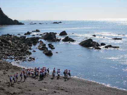 午前中のメインの活動は磯観察。すぐそばの宮崎浜まで、少し歩きます。小山をこえると太平洋の絶景が広がります。磯には、ヤドカリやウニがたくさんいて、子どもたちは生き生きと活動していました。子どもの中にはおいしそうなサザエや大きなムラサキウニをとって、満足そうな表情で友だちに見せていました。