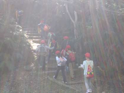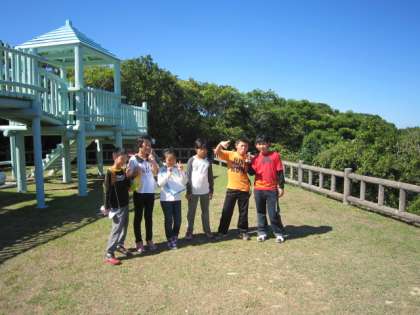 午後の最初の活動は、「浦山ラリー」。施設内の山の中を、グループでポイントを巡り、問題を解きます。険しい道もあり、へとへとになりながらも協力してがんばっていました。山の砦というポイントでは、すばらしい景色も見ることができました。