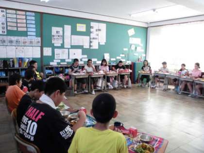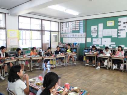 先週より、1組 2組で交流給食をしています。今日は、「運動会への気持ちを高めるため」「明日の全校練習を前に、応援の練習をするため」赤組・白組にわかれて給食をたべました。