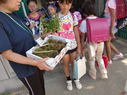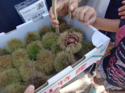 朝,地域の方から栗が届けられました。いがに包まれたままのものです。校門の前の人だかりはそれだったんですね。