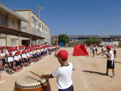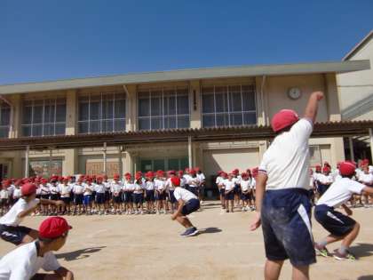 本番当日は日よけのテントを張ります。今日は練習ですからテントはありません。秋らしくなってきたとは言いながら日差しをしっかり受けて赤組が頑張りました。