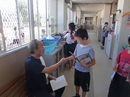 『百人一首』の暗唱テストを終えたところへ3年生がやってきて,「校長先生,インビューしてもいいですか?」。