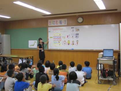 4年生が英語活動で「お天気キャスターになろう!」という単元を学習しています。今日は、いよいよ「お天気キャスター」と「アナウンサー」になって、各地の天気についてのやりとりをしました。