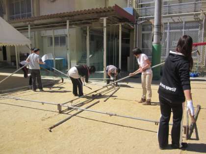 担任外の教職員と教育実習生や学生ボランティアなど若者の力を借りながら、何とか午前中に7梁のテントを張り終わることができました。