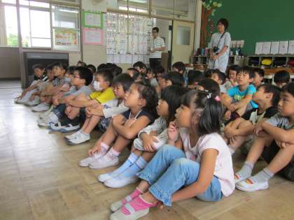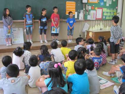 3年生が4時間目に,学校の行事の説明に1年生の教室に来てくれました。