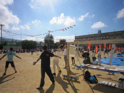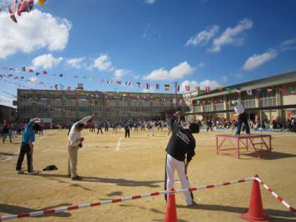 区民運動会の開会式の後には、参加者全員で準備体操がありました。けがのないよう、しっかりと体操をされていた方がたくさんおられました。遠くから全体を見ていると、たくさんの方が一斉に同じ動きで体操すると、とてもきれいに感じました。