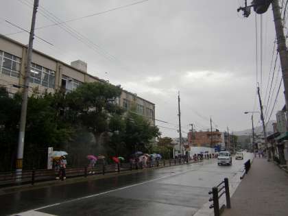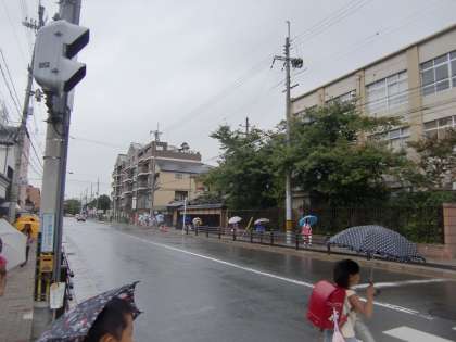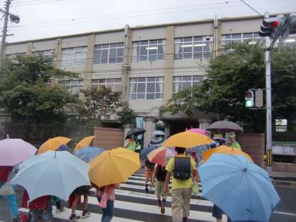 台風が接近する中,子どもたちが登校してきました。久しぶりの雨の中の登校です。