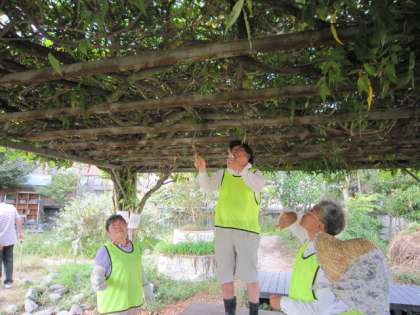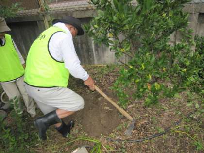 校門付近の水仙を植えた後、いつものようにビオトープの作業もしていただきました。みかんの木の近くに穴を掘って烏骨鶏の鶏糞を埋めて肥料にしたり、藤棚の枝払いやせせらぎ近くの草刈りなどを黙々としていただいたりしました。10月だというのにとても暑くて、汗をいっぱいかきながらがんばっていただきました。ありがとうございました。