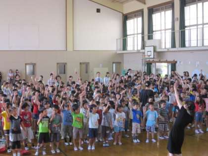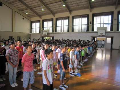 いつもの朝会と同じように、今日の終業式の前にも歌を練習しています。今日は、英語の歌詞を聴き取れたときに手を挙げて、楽しく歌いました。始業式の前にも練習します。