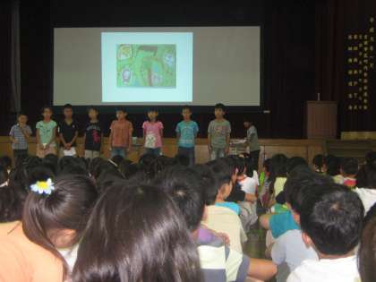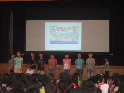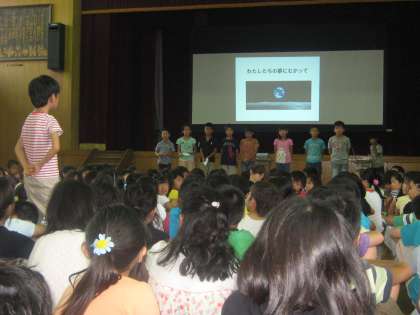 3年2組の発表がありました。1年生・2年生で学習した英語で身についたことやこれから英語を学んでこういう風になりたいということを,しっかりと発表できました。