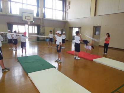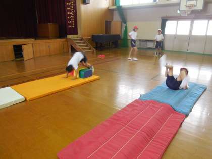 開脚前転・後転や側方倒立前転など,様々な技に挑戦しています。