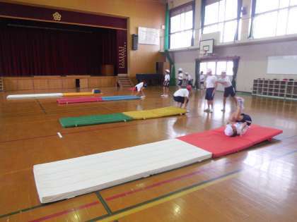 踏切板を入れて坂道を作り,回りやすくする「後転の練習の場」