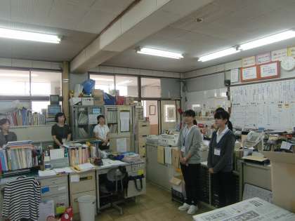 写真は職員朝礼でお別れの挨拶をする実習生たち。