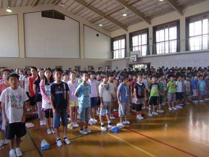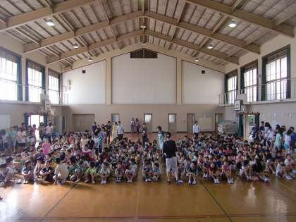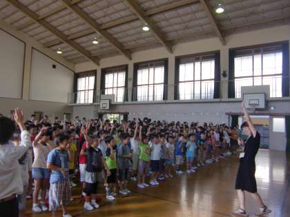 写真は終業式直前の様子です。みんなでハロウィンの歌に合わせて体を動かしています。