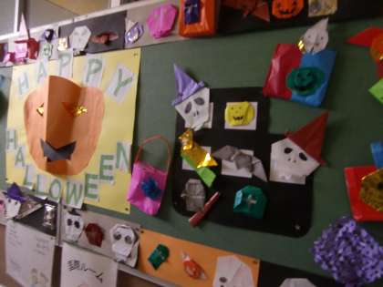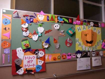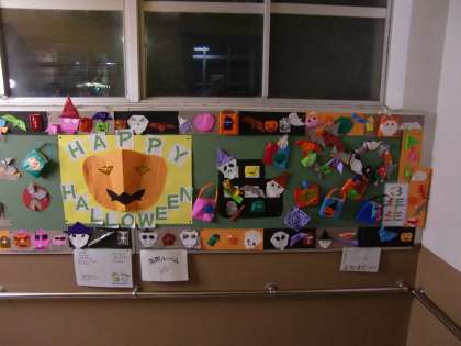 ハロウィンの掲示物なら本館2階へ上がる階段の掲示板のこんなに見事な作品があります。3年生が作りました。力作です。