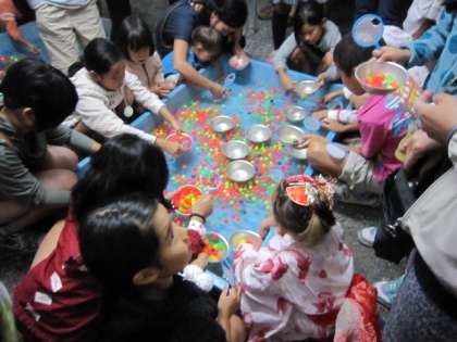 吉田今宮社のお祭りの前の晩の夜店です。いつもどこかでお世話になっている地域のみなさんがいろいろなお店を開いて、子どもたちにとっては知ってもらっている大人がいっぱいの安心できる空間のようです。