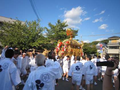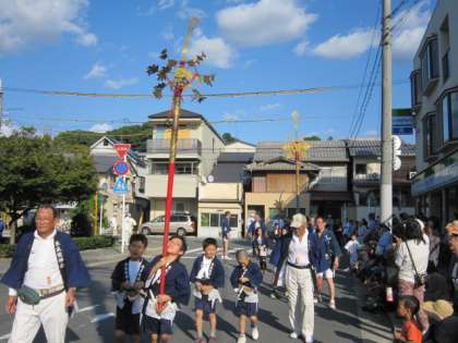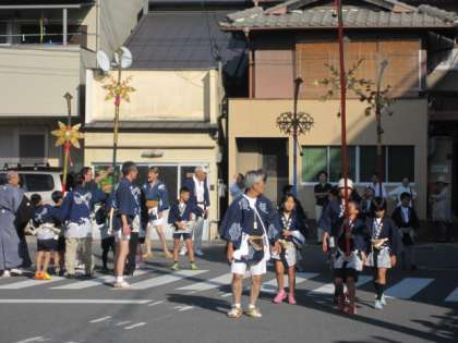 学校に引き続いて、近衛中学校の近く、下大路町にあるコンビニ前での発表がありました。お神輿が到着するまでに、剣鉾が道を歩きます。大人の剣鉾は、電線とぶつかるかと心配しました。子どもたちは、疲れることもなく、元気な姿で、最後まで剣鉾をさして歩き切りました。