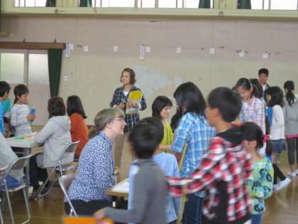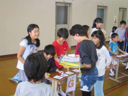 ハロウィンをテーマにしたいろいろなカードをグループに分かれて集めます。お店の子どもたちといろいろな会話のやりとりをする中で、みんな楽しそうに笑顔があふれていました。ボランティアのお母さん方とも、楽しく英語で会話し、身近にたくさんの英語を話すすてきな方がいることに気付いていました。