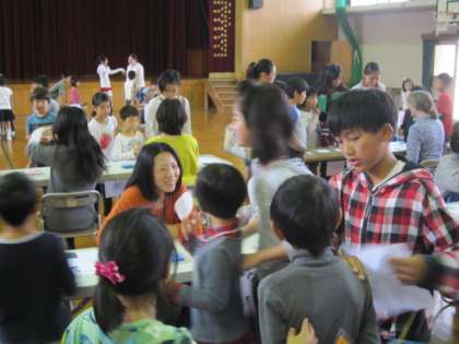 2時間目は、1年・3年・6年生での「にこにこイングリッシュでした。ライオングループとキリングループでお店をする番とお店を回る番に分けて行われました。