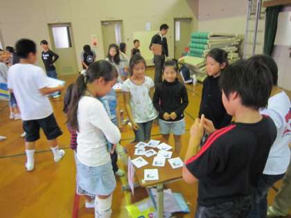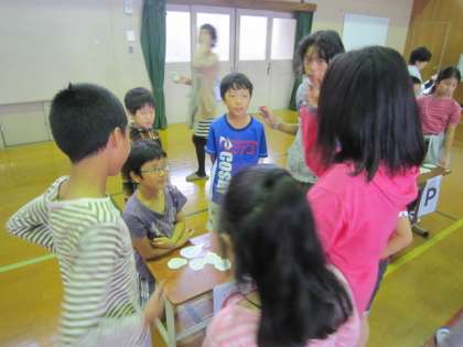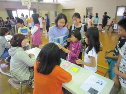 3時間目は、にこにこイングリッシュの後半でした。2年・4年・5年生が集まって、前半の子どもたちと同じ内容をしました。グループで回っている2年生の様子から、1年間でずいぶん成長し英語に慣れ親しんでいることがよく分かりました。4年生5年生でも、それぞれこれまで学習してきたことを使って、楽しくコーナーを回ることができていました。ボランティアのお母さん方とも笑顔で会話し、楽しい時間になりました。