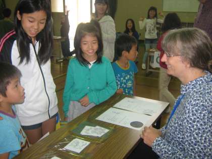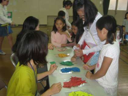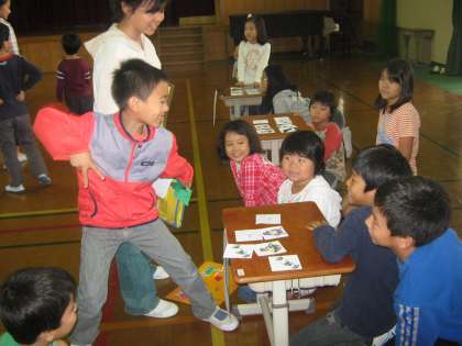 にこにこイングリッシュで2時間目は,1年生・3年生・6年生の活動でした。今日の縦割りグループの中で3年生はリーダーを助けて、1年生にもアドバイスして活躍していました。