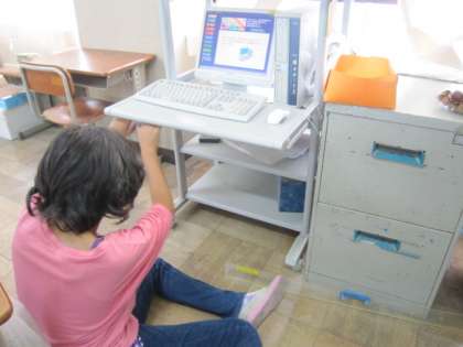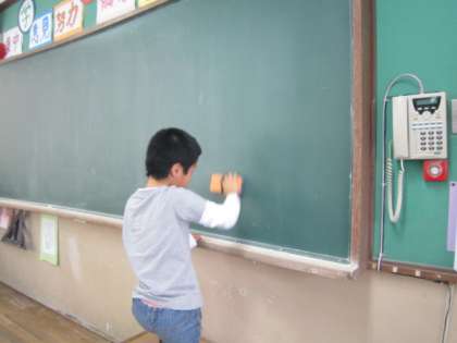 他にも,こんなところ?!と思うパソコンの棚の裏?を掃除している人もいます。もちろん,普段の教室の場所もがんばります。見てください,黒板が光っています。