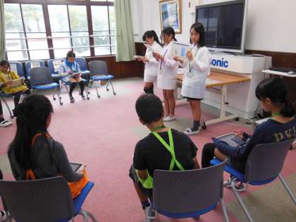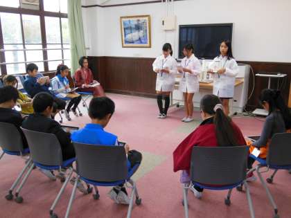 薬局では,各社から一名を集めてセミナーを行っています。セミナーを受けた社員は,ブースに戻って報告を行いました。
