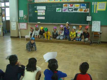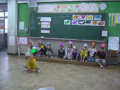英語活動の時間にげきあそびをしました。動物になりきって楽しくげきあそびができました。友だちのすてきなところをしっかり見つけられた子もたくさんいました。「もっとやりたい!」と話す子もいて,とても嬉しく思いました。