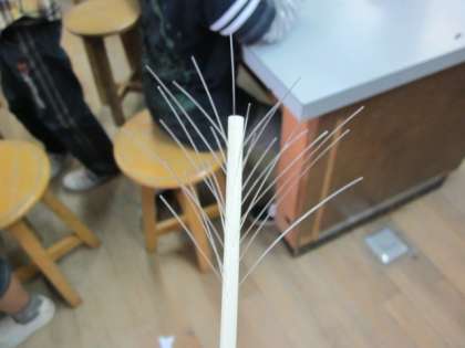 光ファイバーのしくみがわかったら、次は、いよいよ「ファイバーツリー」をつくります。細かい穴をたくさんあけたストローに、先ほどの光ファイバーを差し込み、ハサミで適当ながさに切ります。それを何度もストローの穴全部にします。