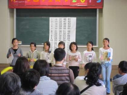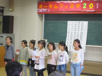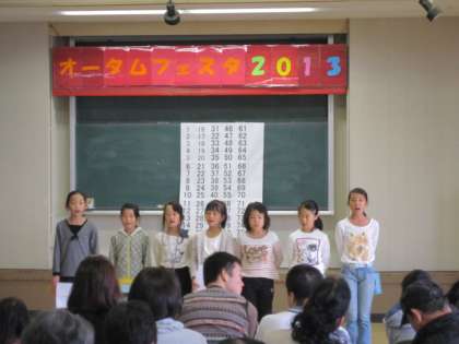 オータムフェスタの舞台で音楽隊の子どもたちは3曲歌声を聞かせてくれました。「うさぎ」「まっ赤な秋」「カントリーロード」ときれいなやさしい歌声を披露してくれました。特に最後の「カントリーロード」は、高音もはっきりと響かせて歌い、練習してきた成果が感じられました。聞いていたお客さんも、褒めておられました。