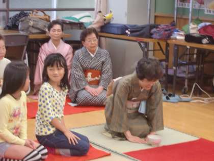 5年生がスチューデントシティ学習に出かけている時に学校では午前中の4時間を使って,3年生・4年生対象の茶道教室がありました。1クラス1時間という感じで,茶道体験をさせてもらいました。