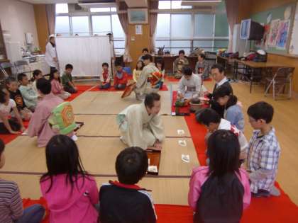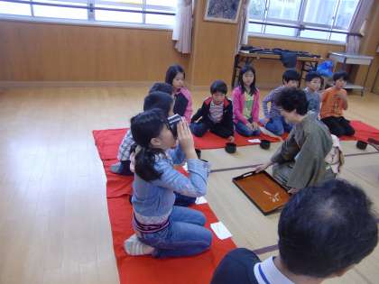 お茶をたてるのではなくて,お客様としてお点前を披露してもらう,つまり,お・も・て・な・しされる側です。4年生は全員が昨年の経験者ですが,3年生の中には初お茶体験の子がいて,とても喜んでいました。
