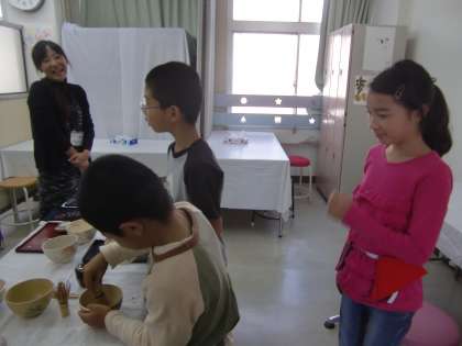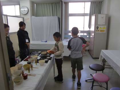 よしだ学園の『オータムフェスタ』ではお茶席が作られます。そのお茶席のお手伝いを四錦の部活茶道の子どもたちがしています。