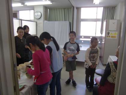 私が様子を見に行った時はお客さんが概ねひいた後で,子どもたちは少し手持無沙汰な状態でしたが,甲斐甲斐しく何かしているような感じを出して写真をとりました。世に言う『やらせ』です。