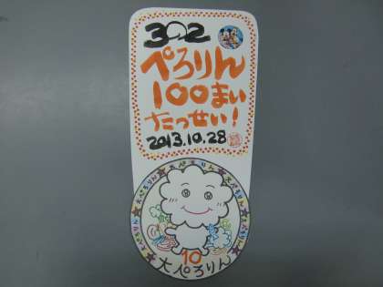 ぺろりんが10枚で大ぺろりん1枚と交換です。ですから,10枚目の大ぺろりんを渡されるということは,ぺろりん100枚,つまり,今年度になって給食を完食した日が100日に達したということになります。これって,すごくないですか…?