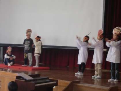 朝会直後の『朝会発表』はまず1の2です。サルのお面をつけて登場する子もいました。入学してからここまでに学習してきた英語活動について,上手に話してくれました。