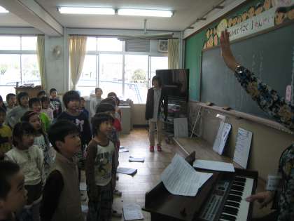 学習発表会で発表する「くじらぐも」の劇の中にある「いつまでも ともだち」という歌の練習をしました。