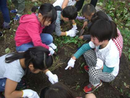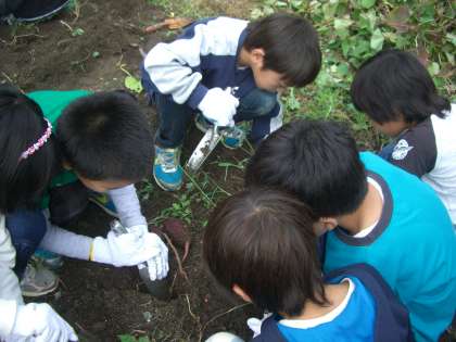 苗から育ててきたさつまいもを収穫しました。土を掘ってさつまいもをみつけるたび歓声が上がっていました。地域の方にいろいろと教えていただいたおかげで,立派なさつまいもが収穫できました。ありがとうございました。