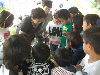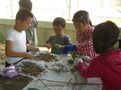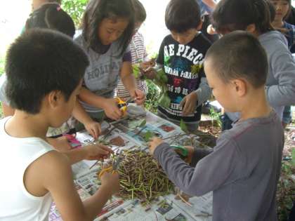 「さつまいものつるも食べられるよ。」と地域の方に教えてもらいました。やわらかいものを選んで,葉を落とし,短く切ります。みんなで協力してたくさんのつるを切ることができました。つるは,地域の方にお世話になり,みんなで食べてみる予定です。